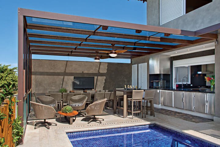 Uma das grandes vantagens de se utilizar a cobertura ou telhado em esquadrias de alumínio com vidro é a certeza que o ambiente ganhara muito iluminação natural sem aquecer o ambiente, esse modelo de cobertura ou telhado em esquadrias de alumínio não representa perigo de impermeabilização como outras coberturas.