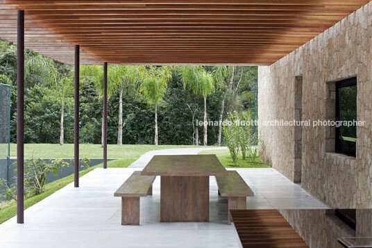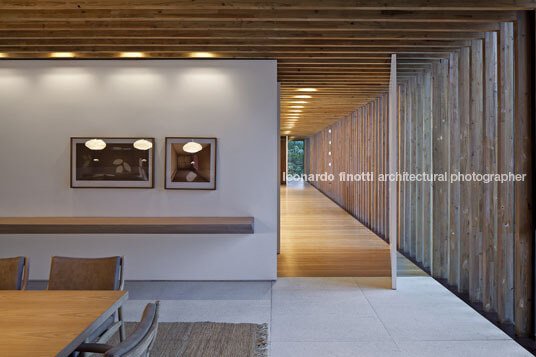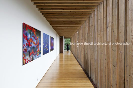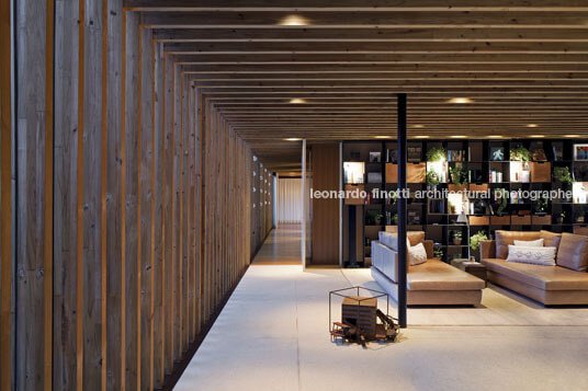 Durante o dia os pórticos criam um jogo de luz e sombra estimulante, à noite, a luz torna a construção acolhedora com a ajuda da iluminação natural que entra nos ambientes através das esquadrias de alumínio.