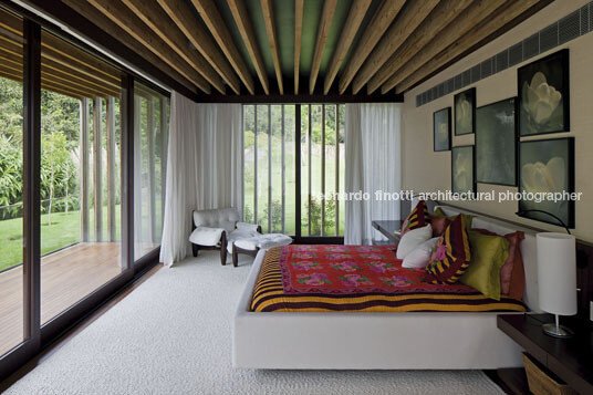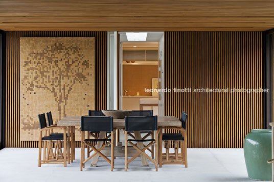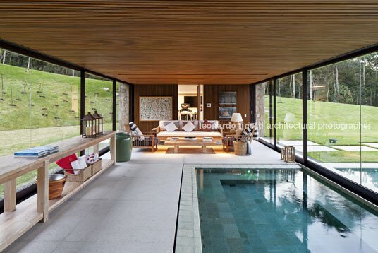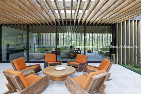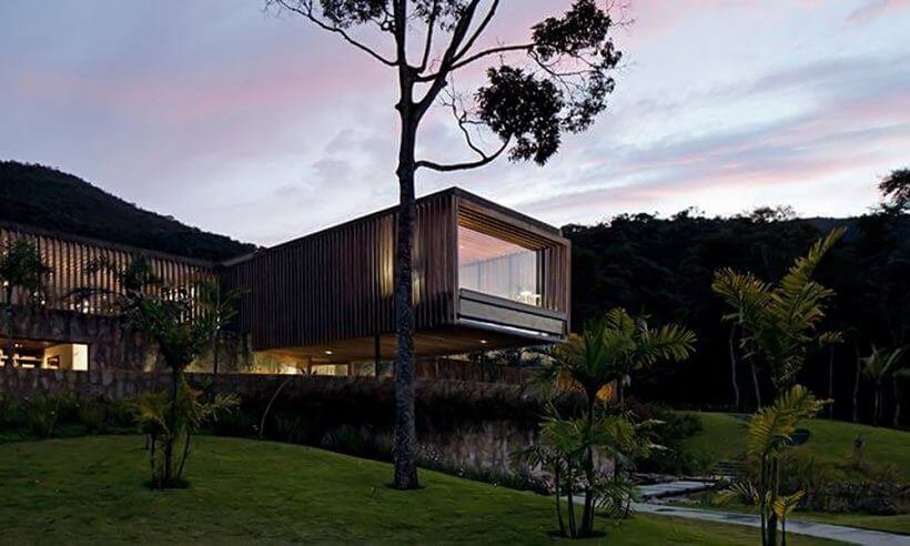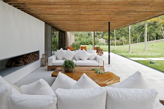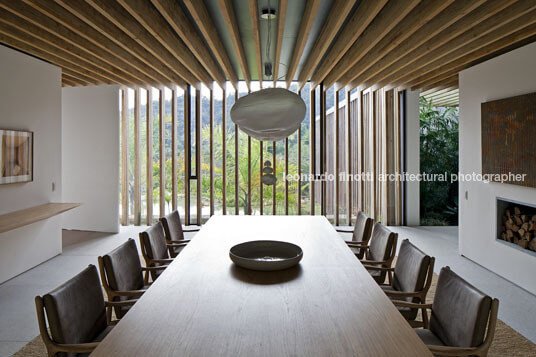 Nesse projeto residencial integrada a natureza com presença de grandes painéis de vidro e claraboias permite a entrada de luz natural. Dependendo da luz do ambiente, várias sensações vêm à tona.